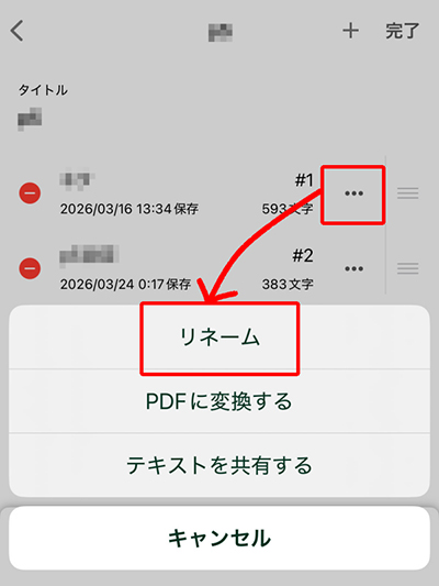 テキスト名の横に表示されるメニューを選択、「リネーム」で変更します。