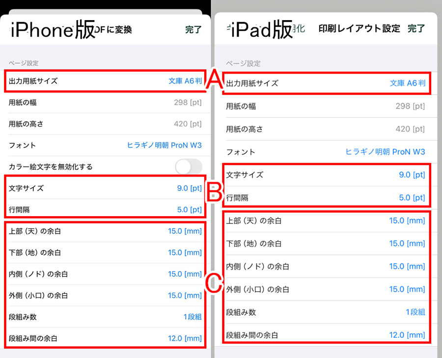 出力用紙サイズ・文字サイズ・行間・余白・段組を設定します。