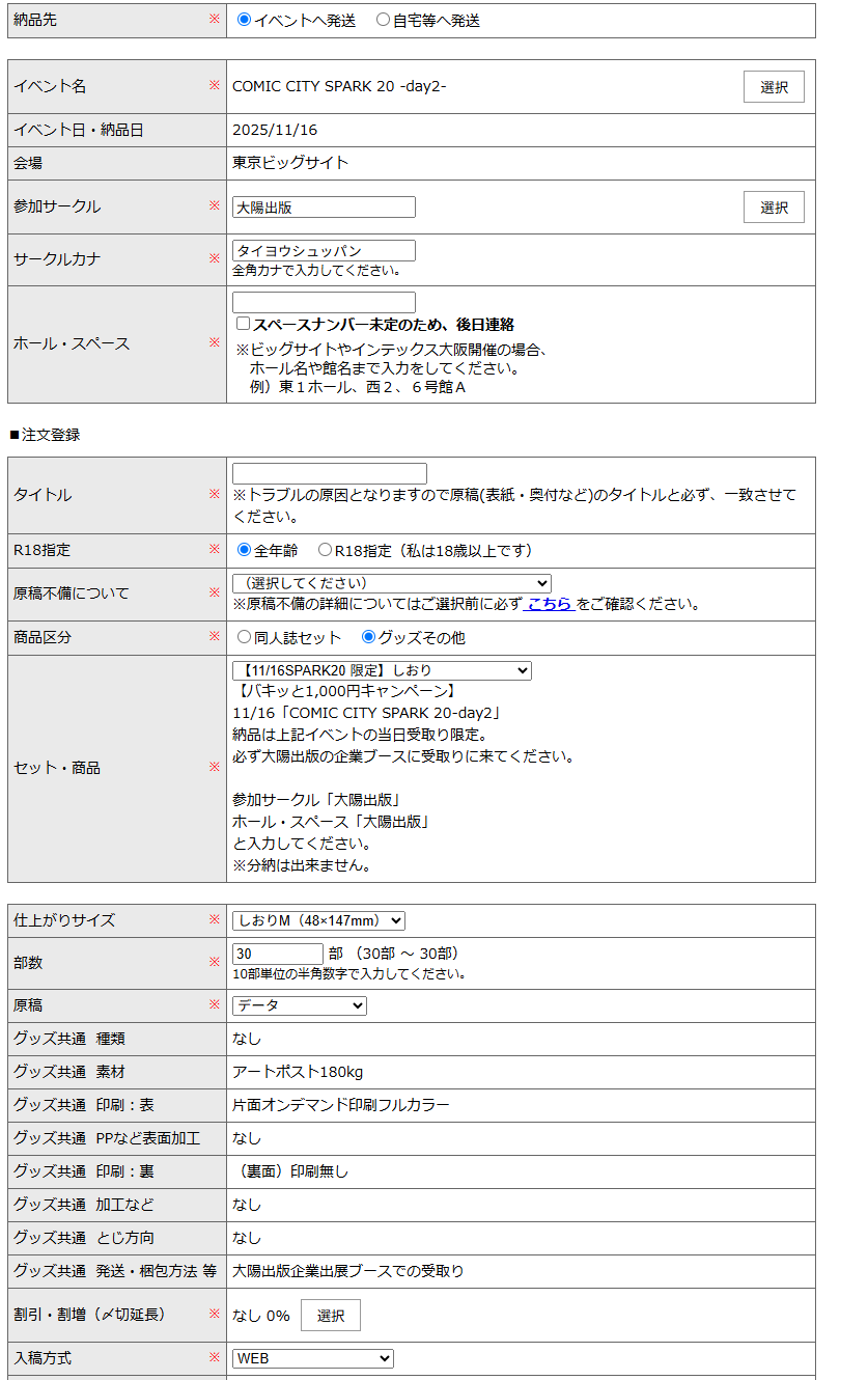 ②「商品区分」→「グッズその他」→「【11/16SPARK20 限定】しおり」をご選択ください。