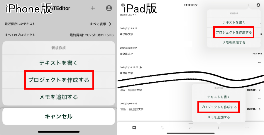 複数の章に分かれている場合や短編集などを書く場合、事前にプロジェクトを作成することで作品の整理がしやすくなります。-
