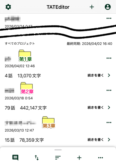 複数の章に分かれている場合や短編集などの場合は、プロジェクトを使うことで整理がしやすくなります。-